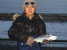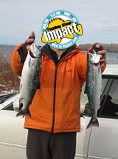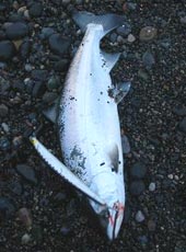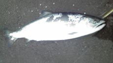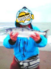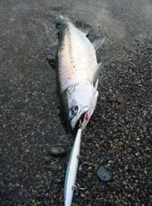 釣れてないのかな?一瞬不安がよぎるが、いつ「ジイー」とドラグが鳴ってもおかしくない海況、小川の右を丹念に撃っていたM氏のロッドが弧を描く。慎重なファイト。間もなく上がってきたのは間違いなく50程度の本命。M氏とがっちり握手し、2009シーズンの幕開けの祝福。回遊している。すかさず撃つ。右に50Mくらい行ったところでデコの赤金を装着しミデイアムリトリーブの直後、竿が叩かれる。きちゃった。バレんなよ。けっこういい引きだ。うねりにもまれて多少苦労したが、3回目の波に乗せてランデイング成功!やった!一安心。シーズン一本目が緊張すんだよね。