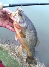 を狙い撃つ!!まずは手堅く1本捕っとこうってコトでチビバスポンドでtomuオススメのリグでの1投目!リグを沈め、ボトムを取って(たぶん(^^))厳冬期を思わせるフィネスゲームを思いだすような軽いシェイキングを入れながらのリフトフォール…ズン!!食った〜!!チビ