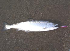 3/22 仕事で 3 月はとても忙しい。 3 連休は皆さん釣りに行ったとの情報収集。 どうやら津軽海峡にもサクラが来たようで、以前から通っているサーフに朝 6 時に入る。 皆さん素通りでこんなとこ?みたいな場所です。 (*^▽^*) 当然の事ですが誰もいません。