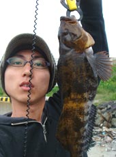 とりあえずまだダーティングしていなかったポイントに、行き縦にしゃくってみること数投・・・・・ なんかきた〜〜〜〜(^ω^)〜(笑) しかも緩くしてたドラグが出まくる〜竿が激しなり〜〜笑 とりあえずドラグをロックして、強引に水面によせると・・・・・・・・ デかい!太い!タモがない!久しぶりのgood size!笑 仕方ないので空気を吸わせて弱らせて、リーダー16ポンドをつかみおりゃ〜〜〜!! ランディング成功! ちなみにフックはメバル用!(笑) 危なかった〜〜(><) サイズは44pアイナメと大物釣りが苦手な自分の自己記録更新!!(笑) ヒットワームはママワームシラウオ2in。