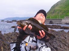 まだまだ釣れそうな空気が漂う中、気合を入れてキャスト。沈み根の中にスリットを発見!その隙間をリフト&フォールで通すと1投目で「ドスッ!」ときました!磯ロックのこの強烈なバイトがやめられません!!ラインスラッグを巻き取り、渾身の力でフッキング!一気に引きずり出そうとしますが、相手も反撃。根に突っ込み簡単には寄ってきてはくれません。ロッドのパワーをフルに使いポンピングで浮かせ、手前まできたら一気にブッコ抜き!キャッチしたのは丸々と肥えた47センチのアブラコ(アイナメ)!!バークレイ・5インチパワーホッグをガップリとくわえていました。ありがとう!!と優しくリリース。