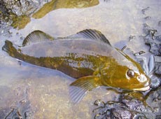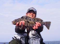 まずは 3/4OZブラシンボール+エコギア・パワーシャッド5インチでシャローエリアをスイミングで狙いました・・・まったく反応が無し。、少し深いエリアに移動してみることに。読みがあたり田嶋君にヒット!!ロッドもバットから曲がりナイスフィッシュの予感!キャッチしたのは40アップのアブラコ(アイナメ)!やったね!!田嶋くんのヒットルアーはバークレイ・パルスワーム4インチです。