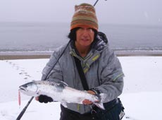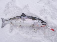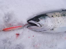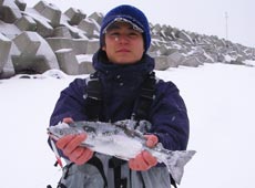 10分後、沖目をスローリトリーブで狙っていると「ガッ!」というバイト!同時に水柱!40cmのサクラマスキャッチ!小型ですが嬉しい1匹!ヒットルアーは岡ジグ・AT−30インパクトオリジナルカラーレッドヘッド!!
