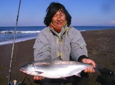 3月2日、岡クラフトの岡さんと日本海方面へ。サーフには20人位のアングラーがずらりと並び大賑わい。夜明け直後で放射冷却現象のためか気温がかなり低く、魚はまだ動きそうもない様子。日が昇り暖かくなってからラン&ガン開始!岡さんが先行し狙っていると早速バイト。何度かバイトがあるのですが「ヌッ」と一瞬重くなりはずれてしまうとのこと。 そこで形状の違う私のフックと交換し試してみることに。フックチェンジが良かったようで次のバイトで早速ヒット!!魚とのやりとりを見るとかなり大きい!?手前まで寄せ、魚の姿が見えその大きさに驚き!デカイ!!岡さんの巧みなロッドワークでランディングしたのは65cmのビックサイズ!ヒットルアーは岡クラフト・プロトタイプのメタルジグ!早くも発売が楽しみです!新しいジグでなかなかお目にかかれないサイズを見ることができエキサイティングな釣行でした。