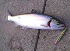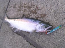 3月9日、市内の埠頭でサクラマスの爆釣現場に遭遇!!ねらって見ると40cmちょっとのサクラマスが早々にヒット!その後も頻繁にバイトがありますがバラしてばかり・・・数匹でルアーを捕りあうため、フッキングが浅くフックアウトしてしまうようす。それでも「ゴッ!ゴッ!ゴッ!」と何度も追い食いしてきます。