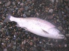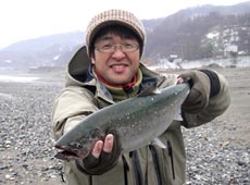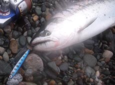 先ずは 50 gのメタルジグで探ってみましたが、何度かバイトはあるがのらないのでルアーを岡クラフト・岡ジグAT30インパクトオリジナルカラー鮭稚魚にチェンジ!するとすぐに強烈なバイトが有りファイトに持ち込めましたが波打ち際で痛恨のバラシ・・・