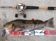 早朝からロックフィッシュ狙いで釣りを開始!テキサスリグにガルプアライブ・3”バルキーホッグを装着し、ボトムをズルズルと引きずってくると「コツン」とバイトらしき感触!そのまま手前まで引いて来ると、「ガツン」と強烈な衝撃とともにロッドが曲がりました。上がってきたのは良型のアブラコ(アイナメ)!これは人生初の50アップゲットか!と計測してみると・・・あと1cm足りない・・・49cmでした(笑)今年も50cmの壁に悩まされそうです(笑) とは言えシーズン初めでこのサイズは嬉しい1匹でした。今年こそは初50アップを目指して頑張ります。