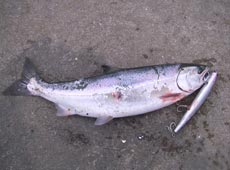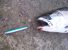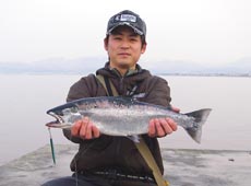 4月25日、仕事前に早起きして近所の釣り場へ朝チョコ釣行!朝5時釣り開始!遠くでサクラマスの跳ねを発見!飛距離の優れ、日もまだ昇りきっていない薄暗い状況に効くタックルハウス・P−Boy Jig キャスティング25gリミテッドカラーのグリーンピンクを選びキャスト!潮の動きもあり、潮目も所々に見えいい感じの雰囲気で期待が高まる。しばらくするとジグの射程圏内で跳ね発見!思いっきりフルキャスト!表層をミディアムリトリーブで狙うと「ガツン!!」ときました!重量感からしてなかなかのサイズ!バレないように手前までゆっくりと寄せてくるとキラキラと光るサクラマスの姿が見え緊張感が高まります。弱るまでじっくりと泳がせ同行者のたじま君にネットインしてもらいキャッチ!!57センチ、2.3kgのサクラマス!下アゴにフックがガッチリとかかってフッキングもバッチリ!良型をゲットでき大満足の朝チョコ釣行でした!