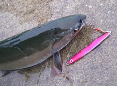その後、ミノーに反応が無くなりメタルジグでボトム付近を狙ってみると・・・フォール中に「ググッ」とバイトがありヒット!またもすんなり寄ってきたのは30cm後半の小サクラ。1匹目よりサイズアップ!(笑)ヒットルアーは岡クラフト・岡ジグAT−30ワインレッド。小型でしたが2匹ゲットできて満足し終了しました。