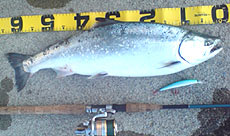 6月1日、朝2時に起きて、仕事の前にちょこっと釣行にでかけました。釣場に到着し夜明けとともに釣りを開始!ランガンしながら、ルアーをミノーに変え、さまざまなアクションを試しながらの数投目で待望のヒット!スローなただ引きにガツンと来ました!ランディングして計測すると65cmのグットサイズ!重量も3.3kgありました。まだまだサクラマスは熱いようです!仕事前のちょこっと釣行オススメです!