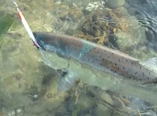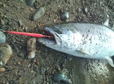 久しぶりに朝一からの釣行。そろそろサクラは終わりだし、ドカッとデカいのをいっておきたいので、知内からスタート。が、期待とは裏腹にまったく無反応。一回アカハラが跳ねただけか ww 帰り道ダメ元で入ったポイントで、10投ぐらいでガン!と同時に水面でバシャバシャローリング!根でラインブレークしないよう慎重にランディング。岡クラフト・岡ジグLT−30・アワビアカキンで。ギリギリ60cm!やった〜 (^o^)