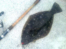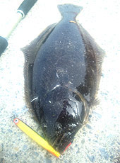先端には投げ師が1人で7本の竿を操るとゆうスゴ師が(^^)近くでキャストするとその人が近づいて来て 「夜中から今まで入れ替わり立ち替わりでやってたけどみんな駄目だって言って帰ってったよ〜」 と、なんとも寂しい情報をいただくf^_^;…が! 次のキャスト(2投目)でガガン! 「来たぁ!」 「ほんとにが!?」 「でかくはないけどヒラメだよ〜」 と、そのまま抜き上げ 5cm位水を汲んであったクーラーに水を足してキープ(^^) ヒットルアーはバークレイ・4”パルスワームのアカキン!