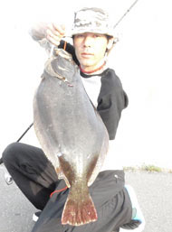 のヒラメレッドを投入。案の定、昆布藁に引っ掛る・・回収しようと強引に巻き取ると「グンッ」と首を振る感触がありそれからファイト開始!!巻いてはラインを出され10分近く押し問答の末、魚体を見て愕然。直径60センチのネットに入らない・・諦めずランディングに挑戦するが