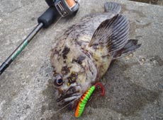8月9日朝6時、知内方面の磯に入釣。5/8OZシンカー+バークレイ・パルスワーム4インチ レッドテールファイアータイガーのスイミングパターンで狙うこと30分、「ゴンッ」明確なバイト!ヒット後、凄い力で根にガッチリと潜られてしまいました・・・ラインを緩めた状態で10分ほど待ち、再び強く引っ張るとうまく根から外れてくれました。苦労の末キャッチしたのは32cmの大型ハチガラ(オウゴンムラソイ)!