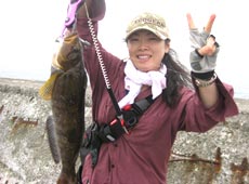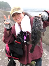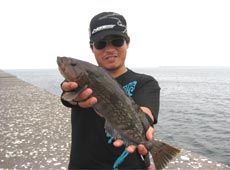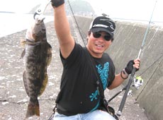 島側と違って灯台側は港の外側なだけに、激流。1ozテキサスでも底はとれず、へちをスイミングで…と思っても全く感覚がつかめず回収…と、水面ギリギリでどんっ!とナイスバイト!!今日初のアブ(アイナメ)をゲット。表層か(・o・)!