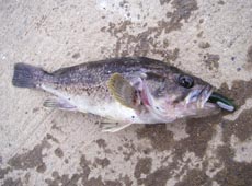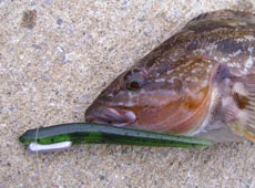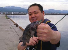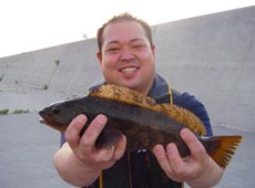 日が暮れ夕まずめの時間。けいすけさんに今までとは違う感触。なかなか良い突っ込みをみせ上がってきたのはアブラコ(アイナメ)40UP!思わぬ良型に満面の笑顔。