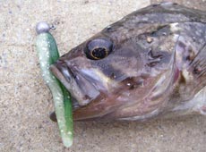 8月17日、新しく入荷したエクストリーム・シンゾーベイト&T -ボーンを試しに森方面へ。ライトモデルのスピニングタックルにシンゾーベイト3インチウォーターメロン+シンゾーヘッド1/8OZをセット。キャスト後、ボトムまで沈めダートさせたりチョコチョコと動かしてみたり。色々試していると早速ヒット!30cmアブラコ(アイナメ)キャッチ!いきなり釣れちゃいました!