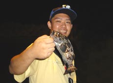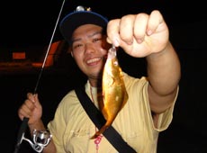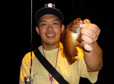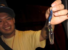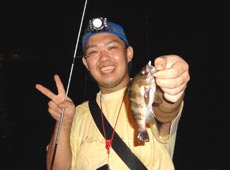 風が強くなり別の漁港へ移動すると、小魚や小さなイカが群れています!なかじー君がキャストすると、アジがヒット!この日の目標にしていたメバルとアジが釣れてなかじー君も大喜び!ヒットルアーはエコギア・ミノーSS