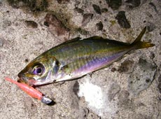 をセット。表層をミディアムリトリーブすると「プルルッ」とヒット!バレやすい魚なのでドキドキしながら慎重にキャッチ。10cmちょっとの