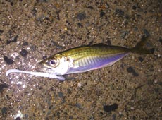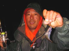 10月9日夜、雨の中でしたがみんなでライトゲーム。多少濁りもありますがアジの反応が良く頻繁にバイト。早速私にヒット!ヒットルアーはツネキチワーム2インチカーリーテイル。