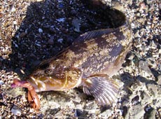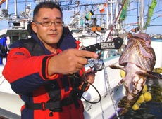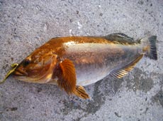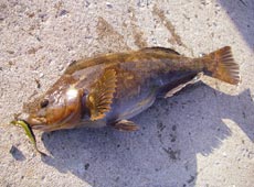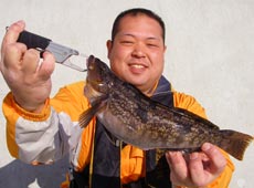 けいすけさんはワームをエコギア・ミノーSのライトテキサスにチェンジ。ボトムをフワフワ と誘い釣れたのは良型のハゴトコ!(スジアイナメ)独特の厳つい顔つきがカッコイイっす。