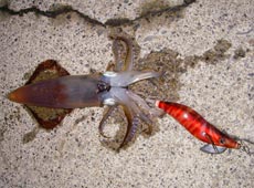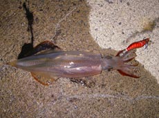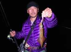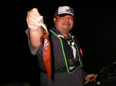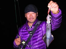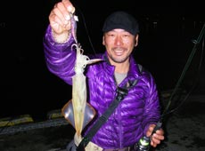 またまた少佐に良型のヤリイカヒット!小刻みなシャクリでボトムを探り2ハイ目。スケルトンボディのピンクカラーでキャッチ!