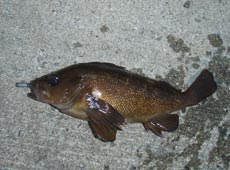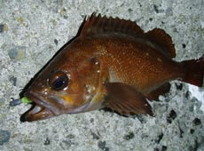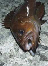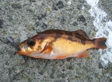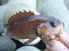 「プルプル」と小気味良い引きで上がってきたのはウスメバル。大きな目と黄金色に輝く魚体、ピンとしたヒレ等、魚マニアにはたまらない一匹!