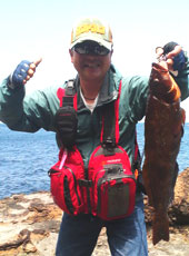 エコギア・ファットグラブ 5-1/2 インチのスイミングでいきなり「ドン!!」これまた凄い強引な引きがむちゃ楽しい!「あっ浮いてこない・・・浮いた!あっやばい!でかっ!!抜ける!?」やっちゃいましたアブラコ(アイナメ)52cm ・ 2.2kg!久しぶりに満足感ある釣りでした! |