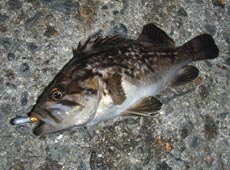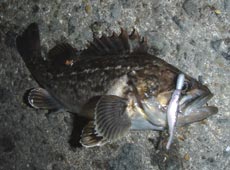 8月9日夜、下海岸へメバル調査。7時過ぎに目的の漁港へ到着。ポイントを見ると、潮の流れが速く激流状態(汗)1 gジグヘッド+エコギア・ストローテールグラブ2”を激流の潮上に向かってキャスト!流れにのせながら時折アクションを加えると早速の反応。小型のガヤキャッチ!