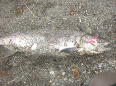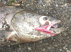 朝4:30から釣り始め、ウキルアーに反応がなくなった8:00頃にヒットしました! カツオの代わりにワーム(ガルプ・ジギンググラブ)をセットしての釣果です。 ウキルアーにカツオでもサケが釣れたのですが、カツオの時よりも食い込みがよく口の奥にフッキングしていました。