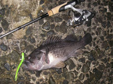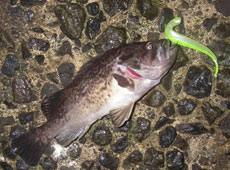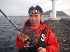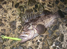 見事アブラコ(アイナメ)ゲット!!防波堤際を丹念に探った釣果です!ヒットルアーはエコギア・ロッククロー2インチ!