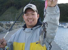 10月1日早朝、仕事前にエギング釣行!フィッシュリーグ・エギリーフラッシュマックス3号をセットし漁港の船道付近に向かってキャスト!さっそく1投目からアオリイカのチェイスがありましたが、あと少しの所でUターン・・・。深追いはせず、違うポイントにキャスト!エギをシャクリ続けていると「ズシッ」と重くなりヒット !ジェット噴射で抵抗しながら上がってきたのは、胴長12〜13センチのコロッケサイズ!その後小型を1杯追加しこの日は終了しました。