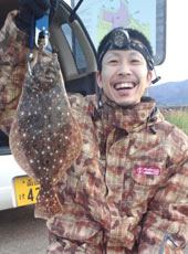 朝方、沖に見える潮目に向かってキャスト!ボトムに点在する障害物周りをじっくりと探ると「コンッ」とバイトがありカジカみたいな重量感。手前まで寄せてくると突然横に走りだしヒラメと確信。1人で魚をタモに入れるのに苦戦しましたが何とかタモに収まりランディング。44cmのヒラメでした!ヒットルアーはバークレイ・バスミノー4インチ・パールホワイト。10月だけでも3枚目!驚きです!!