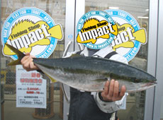 11月27日昼頃、ポイントに到着し海を眺めると、あたり一面大量の鳥山!!ナブラも沸き立ち高活性な状況の中、ダイビングペンシルをキャスト!早いテンポの連続ダイブで狙うと、テトラ際5mの所でペンシルにブリが体ごと飛び出し強烈アタック!ヒット後、一気にテトラの隙間に抜き上げランディング!74cm、4.4kgのブリキャッチ! 魚の処理を済ませ、同じパターンでペンシルを連続ダイブさせるとすぐにヒット!59cm、1.9kgのフクラギサイズのブリキャッチ!先程よりは小型でしたが強いファイトでした!!その後も何度もルアーにアタック!上手くヒットさせることはできませんでしたが2本ゲットできて大満足でした!