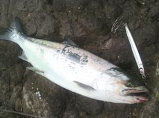 1月4日、上ノ国方面に入釣。さっそく岡クラフト・岡ジグLT−30をキャスト!リトリーブ&ジャークで狙うと8時頃ホッケがヒット!それから粘ること1時間・・・ホッケとは違うファイト!キャッチしたのは人生初のサクラマス!40cm位ありました!カラーはインパクトオリジナルカラーセグロでした!更に20分後、菊池工房・RJミノーの着水と同時にヒット!アメマスキャッチ!新年初釣行は幸先良くスタートできました!