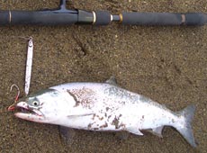 最近、ずっと岡クラフト・岡ジグLT−30を使いこなそうと試行錯誤してなんとかサクラマスを釣っていました。そして29日に釣ったサクラマスで、自分のLT−30の使い方は間違っていないかなって所まできました。3週連続のサクラマスゲットでございますv(^_^)vカラーはインパクトオリジナルカラーのセグロ。ゆっくりと巻くことによってゆらゆらと揺れるアクションが有効なようです。また適度なフラッシングが効いていると思われます。ん〜岡ジグは面白い(^w^)