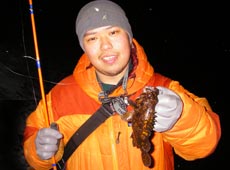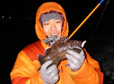 1月30日、仕事帰りになかじ〜と近所の埠頭へ・・・。ULクラスのスピニングタックルにシャッドをセット。手前のブレイクを舐めるようにトレースするとヒット!25cmほどのクロソイキャッチ!再び同じポイントを狙うと連続でヒット!!1匹目とサイズもピッタリで同じ魚???とも思えるクロソイでした。