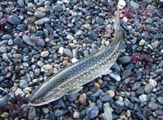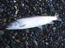 ラン&ガンしていると雰囲気の良いスポットを発見!潮の流れもありよい雰囲気。岡クラフト・LT -30レッドヘッドでしばらく狙っていると沖目で「ガツン」とヒット!かなりの重量感から大物と思い慎重にファイト。手前に寄せ一気にズリ上げるとアメマスのスレがかり・・・。その後、マキやんが見事なイワナサイズのアメマス?をキャッチ(笑)