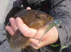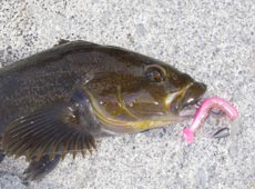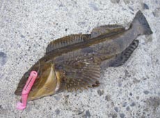 得意のバークレイ・Tテールミノー2.5”のテキサスにてアブラコ(アイナメ)ゲット♪穴の中で「ゴッ」とアタリが手元に伝わってくる、なかなかコンディションのよい出方でした