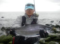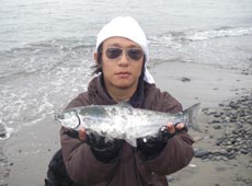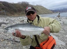 ほどなくして、APさんが「トモさん釣ったみたい!!」とのこと!慌てて駆け付けると・・・トモさん堂々のサクラマス 60up!!!おめでとうございます!!ジグミノーでの釣果です♪