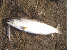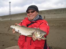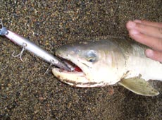 気分をよくし 更にオラオラ…喰え!! 喰ってみろ!! オラオラ…って・・・ドッカーン ! 細長っ!! 海アメ 63cm! この辺でこのサイズは貴重(*^o^*)嬉しい一本♪ サイズ云々より、攻めのトゥイッチで喰わすと超嬉しい(*^o^*) やっぱりミノーイングは楽しいね(≧∇≦)