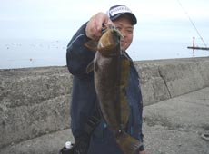 ワームをエコギア・ミノーSにチェンジし引き続き狙っていたケーソンの隙間を探ると、「コンッ」と明確なバイトがありアブラコ(アイナメ)キャッチ!3人ともアブラコ(アイナメ)をキャッチすることができ意気揚々とポイント移動♪