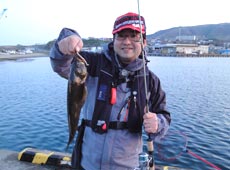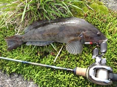 その後2時間ほど沈黙が続き・・・ポカポカ陽気も手伝って”ぽわ〜っ”と完全に釣る気オフモード(笑)するとゴン!といいバイト!ドキっとしながら無意識にフッキング!!40cmくらいの太ったアブラコ(アイナメ)でした。ヒットルアーはエコギア・ロッククロー2”