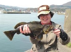 釣れたのは45cmクラスの見事なアブラコ(アイナメ)テキサスリグにグラブ系ワームでのヒット!今日のみさちんさん絶好調です!