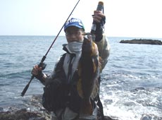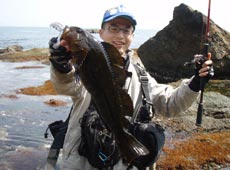 ダメはもともとで狙ってみましたが、ちぎれた海藻が大量に漂い釣りにならず断念。思い切って大きく移動すると風も無く、波&水色ともに良い状況。入釣してからしばらくすると私にバイト!が、食いが浅くスッポ抜け・・・。しかし魚の反応があり2人ともテンションUP!この勢いが良かったのかたじま君にヒット!48cmのアブラコ(アイナメ)キャッチ!デプス・シャダーベイトのスイミングで「ガツン」ときたそうです!さすが!!