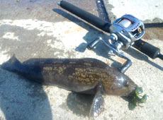 函館港内でアブラコ(アイナメ)4本捕ることができました。1本目は岸際から少し離れた段差らしき障害物に引っ掛かったところでアクションかけるとバイトしてきました。サイズは小さめですが35アップ!