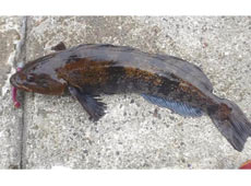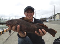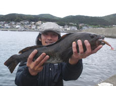 7月22日朝、太平洋側の磯に入釣するもノーバイトが渋い状況。そのため、過去に同行者の新田が58cmのアブラコ(アイナメ)を釣り上げた漁港に移動。テキサスリグにバークレイ・パワーホッグ3インチをセット。リフト&フォールで狙うとさっそくヒット!30cm位のアブラコ(アイナメ)ゲット!