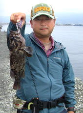 朝になり、アブラコ(アイナメ)狙いにチェンジ!14gジグヘッドにエコギア・グラスミノーL(カタクチ)を装着。堤防際をスイミングさせてくると42cmのアブラコ(アイナメ)がヒット!