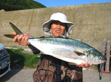 そして、無事ネットイン\(^o^)/ 手際よく血抜きしてもらい、2本目を狙ってキャスト再開したけど、一瞬のチャンスだったようで、その後何事も無く終了しました。 車に戻り、サイズを測ると、62cm、3.5kgとちょっと太めなイナダサイズでした(^m^)
