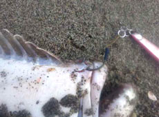 ふと見ると沖目に美味しそうなヨレが ( ゜ o ゜ ) エンドウクラフト・IOカスタム typeC を フルキャストし着底からのジャーク&フォール!ラインスラックをとり更にジャークを・・・ゴン!ありゃ (-.-;) 根掛かりかい・・・ちくしょー!とロッドを煽るとズズ・・・!? Σ(  ̄ []  ̄ ;) 魚だ!強引にリフト!来る来る ♪ たっぷりの重量感と時折ジャー!とドラグを鳴かせるファイトにこれはナナマルいただき♪とニヤニヤしながら寄せる!ロッドはなかなかの曲がり!そしてズリあげ・・・あら!?意外とサイズが・・・!?と多少落胆 (-.-;) とは言えナイスファイトでした・・・ってヲイまさに皮一枚 f^_^; 危なかった・・・